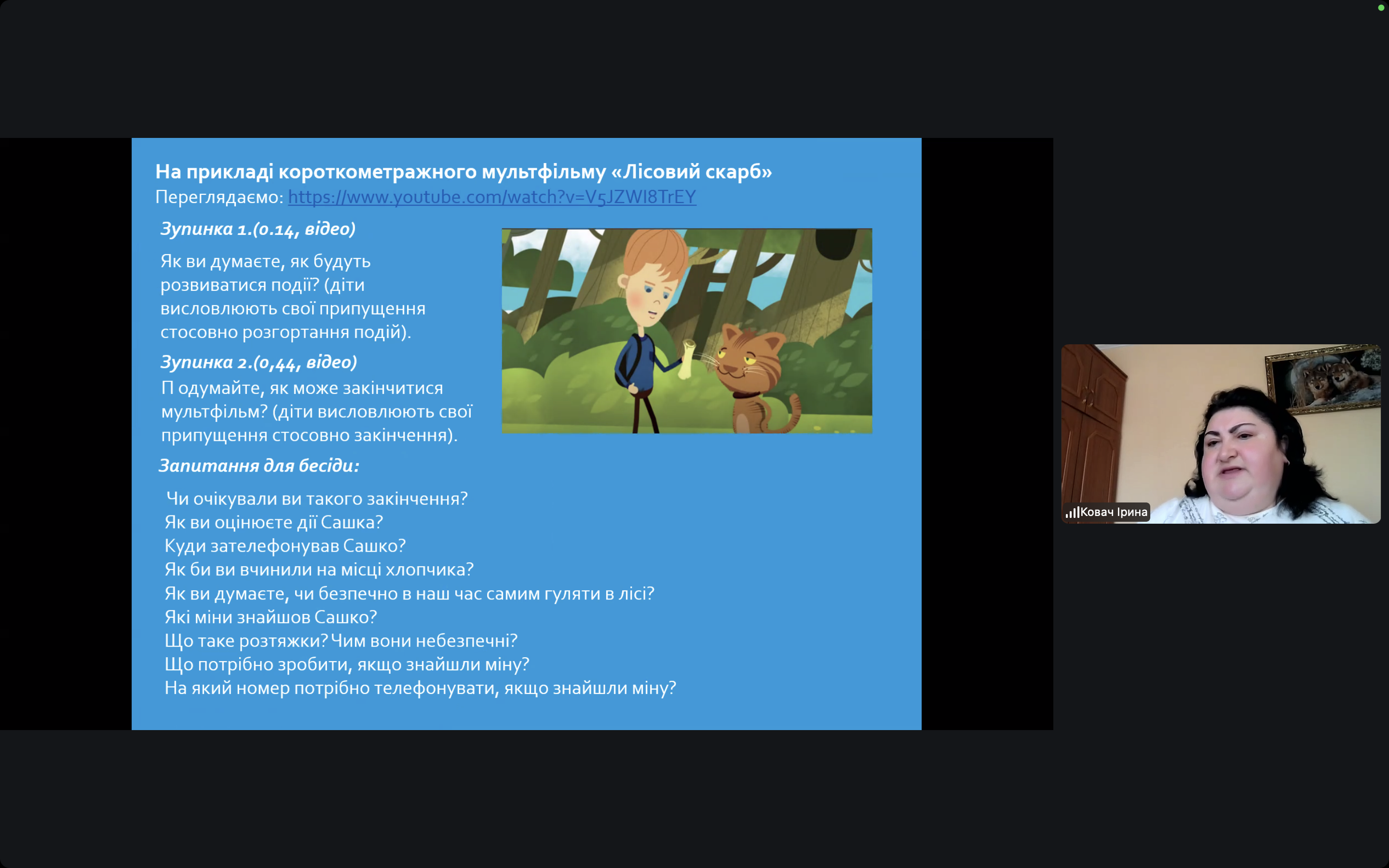 Ірина Миколаївна у своєму виступі про медіаграмотність і безпеку в цифровому середовищі проаналізувала вплив швидких технологічних змін на дитячу пам’ять, увагу та когнітивний розвиток, наголосивши на необхідності адаптації педагогів і батьків до нових форматів мислення та навчання. Особливу увагу вона приділила медіабезпеці в умовах війни, зокрема використанню короткометражних мультфільмів («Повітряний змій», «Небезпечні знахідки», «Лісовий скарб» тощо) та навчальних відео («Що таке міна? Побачив міну?», «Дитяча абетка безпеки від ДСНС») для навчання дітей правилам мінної безпеки. Спікерка надала практичні рекомендації щодо формування критичного сприйняття медіа, розвитку навичок безпечної поведінки в цифровому просторі та поділилася добіркою перевірених ресурсів, посилання на які отримали учасники.