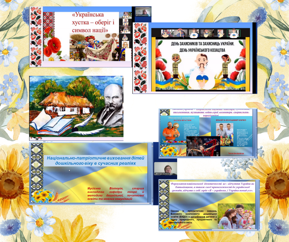В умовах війни, випробувань і змін питання формування патріотичних почуттів та громадянської свідомості набуває особливого значення. У роботі заходу взяло участь 70 педагогів закладів дошкільної освіти Херсонщини. Мусієнко Вікторія Сергіївна, кандидат педагогічних наук, старший викладач кафедри теорії й методики дошкільної, початкової освіти та мовних комунікацій КВНЗ «Херсонська академія неперервної освіти», розкрила особливості національно-патріотичного виховання дітей дошкільного віку в умовах сучасних реалій. Вікторія Сергіївна закцентувала на використанні народних іграшок, зверненні до народних ремесел у щоденному спілкуванні з вихованцями для розвитку зацікавленості історичним минулим Українського народу та формування інтересу до оволодіння надбаннями української культури в її етнічному різноманітті. Домбровська Наталя Вікторівна, Байша Наталя Володимирівна, вихователі Херсонського закладу дошкільної освіти № 9 комбінованого типу Херсонської міської ради представили практичні кейси для роботи з дітьми з формування почуття патріотизму та гідності, любові до Батьківщини. Спікери переконані, що саме педагоги в процесі організації освітнього процесу закладають в дитячі серця зерна любові до рідної землі, мови, культури й традицій.